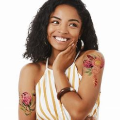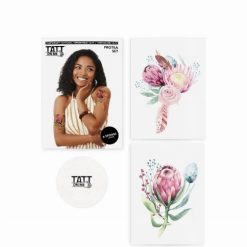 Protea virág ideiglenes tetoválás szett.Méret: 17 x 12 cmA tetoválás vízzel vihető fel,A csomag tartalmaz egy szivacsot is.Felhelyezése: Nedvesítsd be a csomagban található szivacsot, majd helyezd a körbe vágott tetoválást a bőrödre (tetoválással a bőröd felé). Majd a nedves szivacsot nyomkodd rá a papír hátuljára amíg át nem nedvesedik, várj kb. 5-6 másodpercet és lassan távolítsd el a papírt. Az egzotikus Protea ideiglenes tetováláskészlet vad szívű lányok számára készült. Add hozzá ezeket a vakációs megjelenésedhez, és mesésnek fogod érezni magad. Tartsd meg mindkettőt magadnak, vagy oszd meg páros tetoválásod a barátoddal. A készlet 2 nagy, különálló tetoválást és egy felhelyező szivacsot tartalmaz.